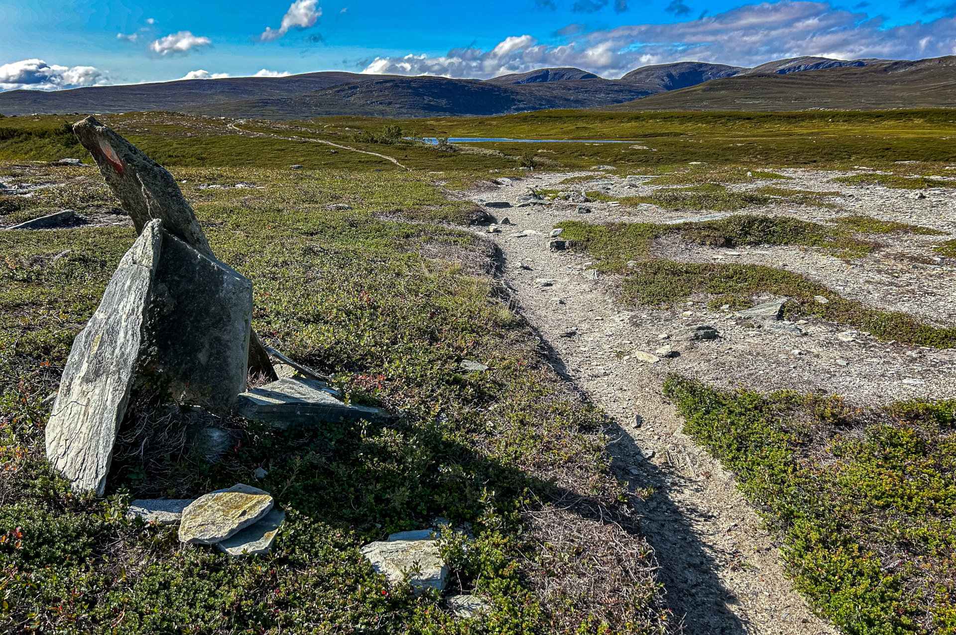 Wenn die 11 km hin und zurück zum Hundshögen zu kurz sind, können Trailrunner nach Belieben eine Rundtour mit anderen kleinen Gipfeln oder Seen laufen. Hier kann man in fast alle Richtungen über Heide durchsetzt von Geröll den Lauf fortsetzen. In diesem Beispiel wurde die Route als Rundtour über den Hästryggen gelaufen.