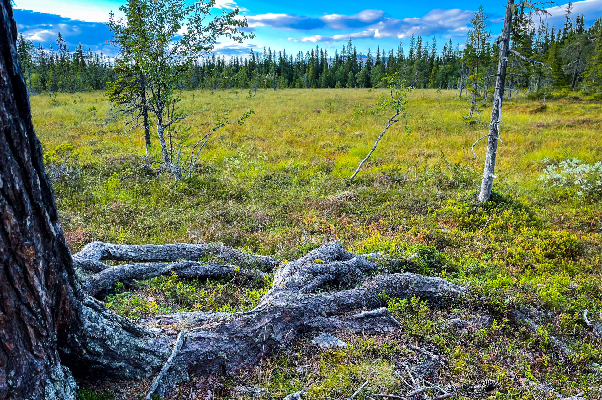Eine alte Kiefer streckt ihr Wurzelwerk über den Sumpf. Im Hintergrund der Hundshögen.