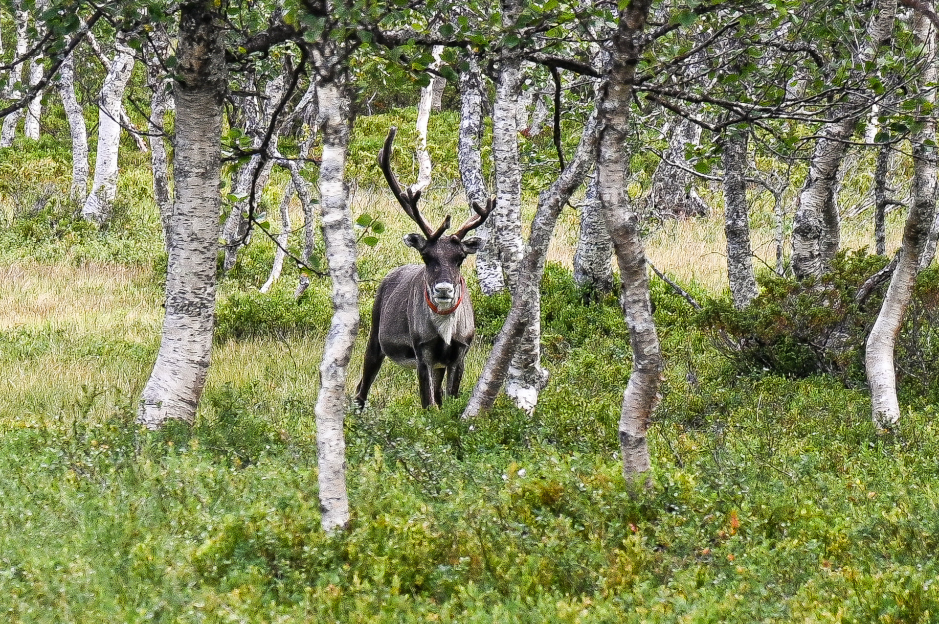 Rentier im Birkenwald entlang des Weitwanderwegs Jämt-Norgevägen