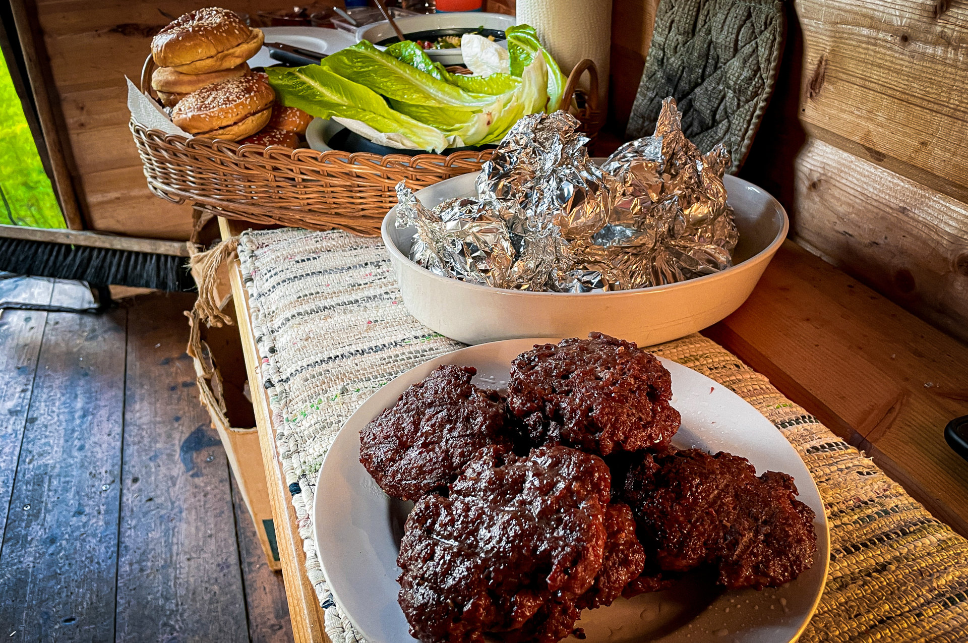 Rentierburger am offenen Feuer in der Grillhütte zubereiten