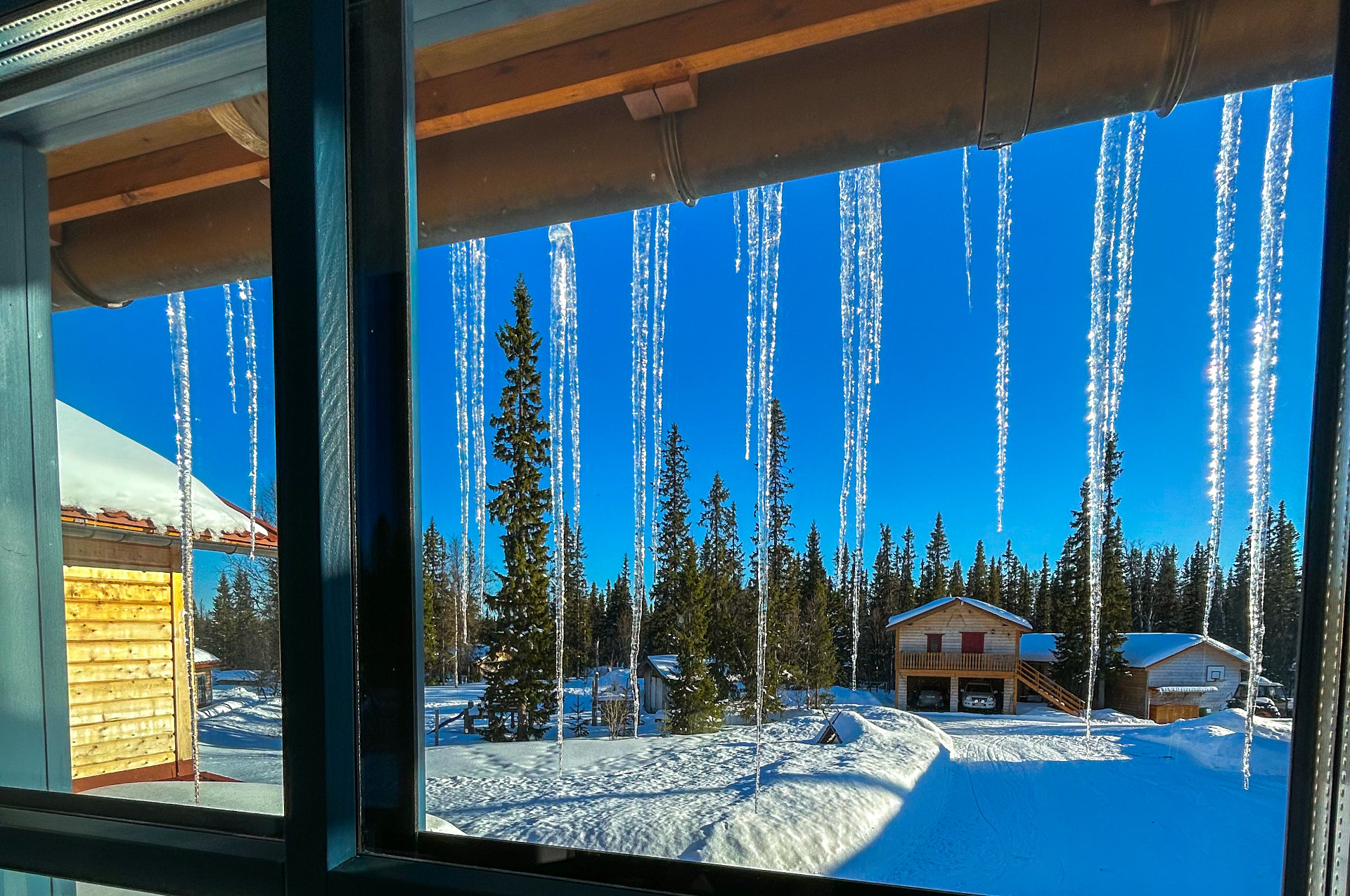 Die Dachrinnen laufen Ende März über und bescheren uns einen tollen Vorhang aus Eiszapfen